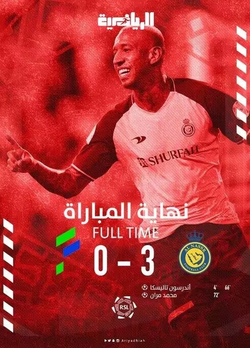 利雅得胜利首发:22-罗西,2-哈纳姆(45’12-布歇尔),17-哈巴利,3-马杜(76’4-法蒂尔),13-科南(84’27-阿马里),8-苏莱西姆,18-古斯塔沃,21-阿尔瓦罗,46-阿里瓦(67’14-纳吉),94-塔利斯卡,29-加里卜(67’16-马兰)
