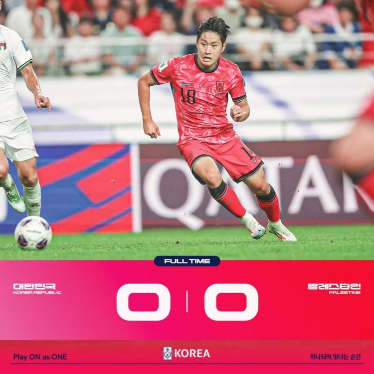 9月5日讯 北京时间9月5日19点,世界杯预算赛亚洲区第三阶段B组第一轮,韩国对阵巴勒斯坦。上半场,韩国没有打出明显优势,巴勒斯坦打进一球但越位无效。下半场,李刚仁错失机会,哈马德连续做出神勇扑救,孙兴慜绝杀空门射中门框,巴勒斯坦补时也错失单刀机会。全场比赛结束,韩国0-0巴勒斯坦。