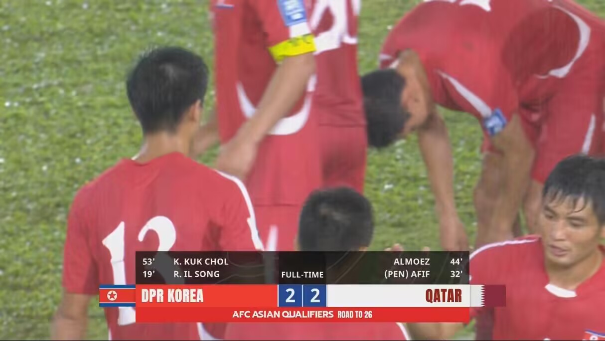 在上半场第28分钟就被罚下一人,少打一人作战长达近70分钟的情况下,凭借姜国哲在第51分钟的超远任意球世界波破门,朝鲜队2-2战平卡塔尔。