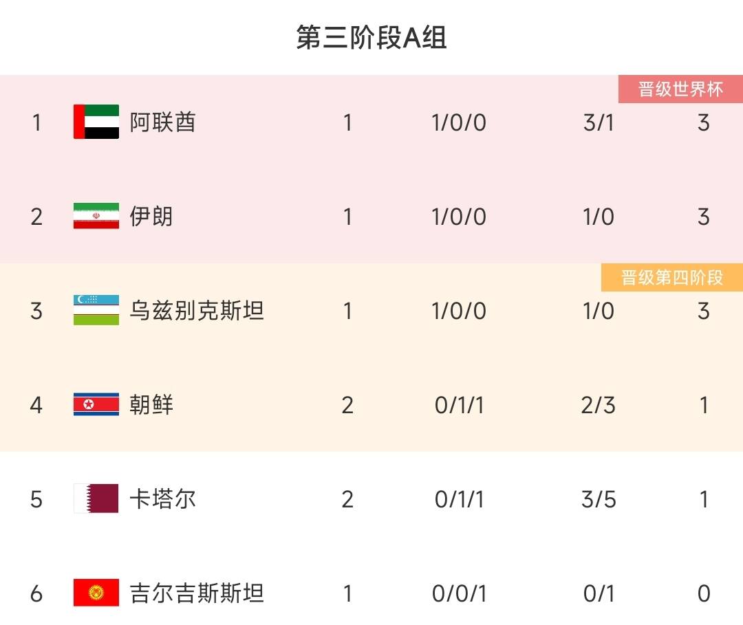 目前朝鲜2战1分排名小组第4,卡塔尔同积1分排名小组第5.