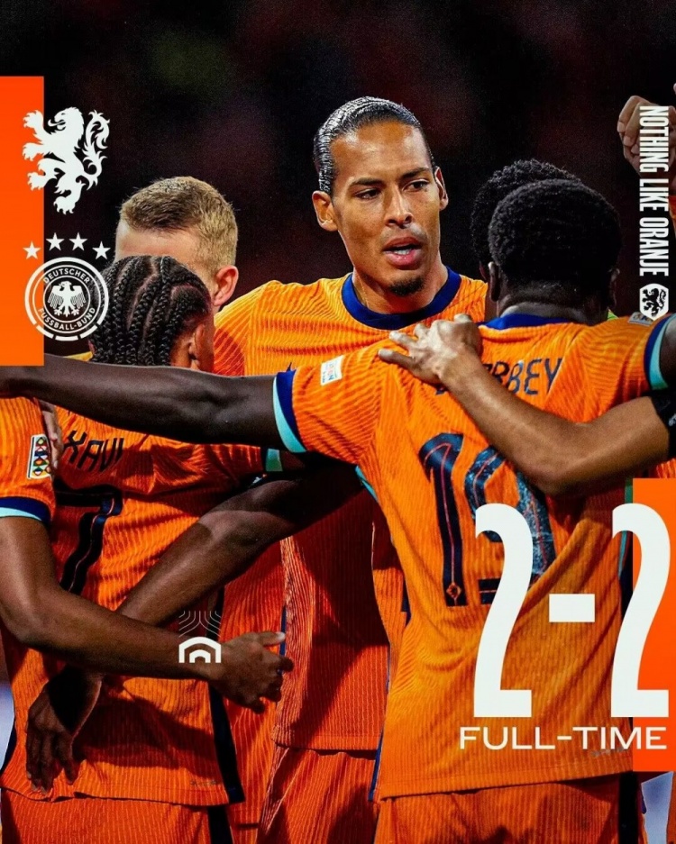9月11日讯 欧国联A级第二轮,荷兰vs德国。上半场,赖因德斯单刀破门;德里赫特送礼,翁达夫扳平;阿克伤退;半场读秒阶段基米希帮助德国反超比分。下半场,邓弗里斯帮助荷兰扳平;哈弗茨错失空门良机。最终,荷兰2-2战平德国。