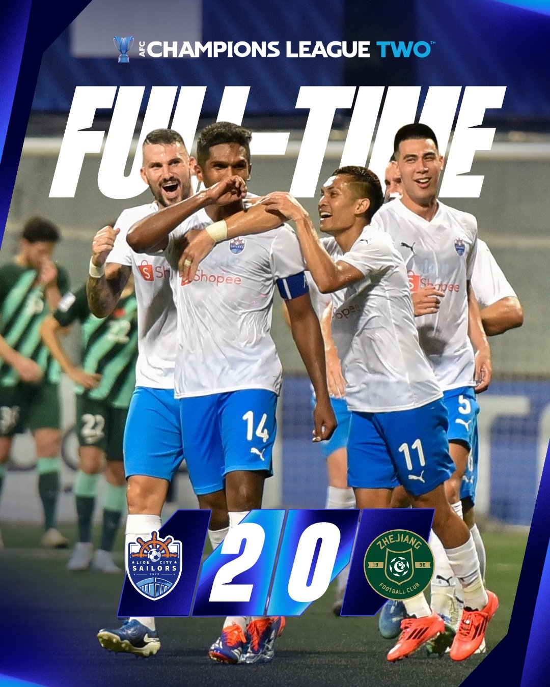 全场比赛结束,浙江队客场0-2不敌狮城水手。