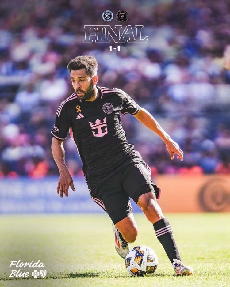 迈阿密遭读秒绝平!第90+5分钟,圣地亚哥主罚角球开出,桑兹力压双人防守高高跃起头球破门,纽约城1-1迈阿密国际!↓