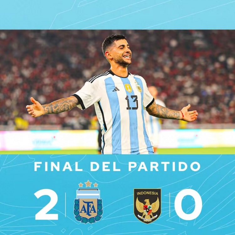 6月19日讯 北京时间6月19日20:30,国际足球友谊赛阿根廷挑战印尼的比赛,上半场布纳诺特失空门,阿尔瓦雷斯失良机,帕雷德斯世界波,半场结束,印尼0-1阿根廷。下半场罗梅罗头球扩大比分,最终阿根廷2-0印尼。
