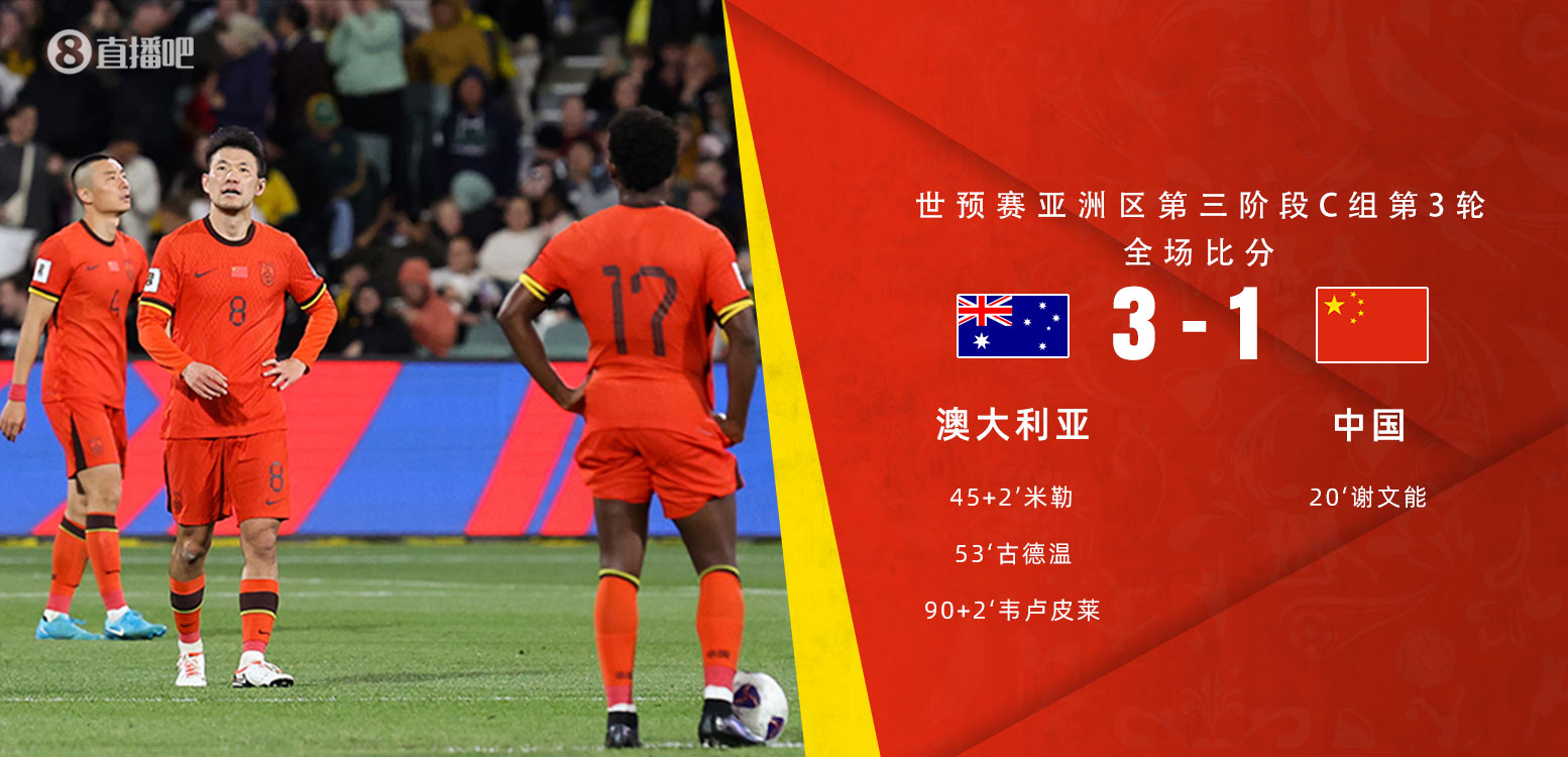 10月10日讯 北京时间10月10日17:10,世预赛亚洲区18强赛第三轮国足客场挑战澳大利亚的比赛,上半场王大雷后场策动张玉宁助攻谢文能低射破门取得国家队生涯首球,补时阶段古德温助攻米勒头球扳平,半场结束,国足1-1澳大利亚。下半场谢文能半场被换下,古德温远射世界波反超比分,李磊伤退,韦卢皮莱补时抽射破门杀死比赛,最终国足1-3澳大利亚连场遭逆转&三连败垫底。