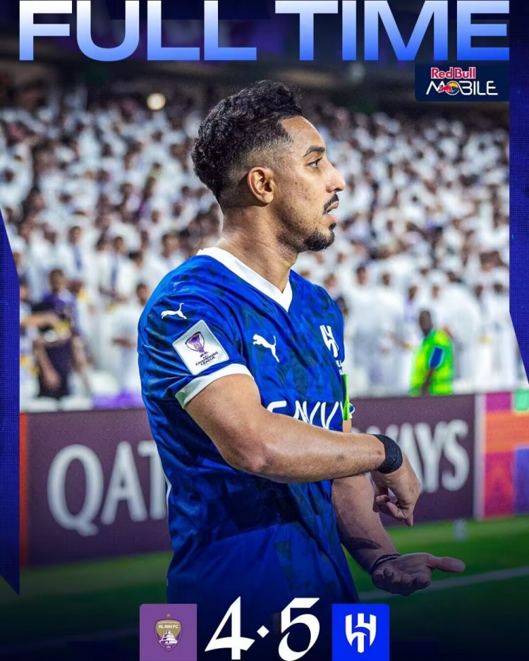 伤停补时12分钟。全场比赛结束,利雅得新月5-4阿尔艾因。