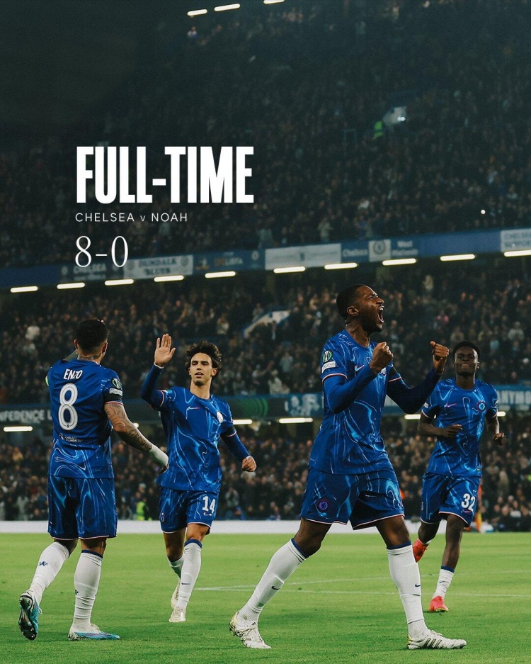 11月8日讯 欧协联联赛阶段第3轮,切尔西主场迎战诺亚FC。上半场,恩佐20分钟助攻戴帽,菲利克斯双响,阿达拉比奥尤、迪萨西、吉乌、穆德里克各进一球。半场战罢,切尔西暂6-0诺亚FC;下半场,恩昆库破门继续扩大比分优势,霍尔造点,恩昆库点射完成梅开二度。全场比赛结束,切尔西8-0诺亚FC,欧协联三连胜升第1!