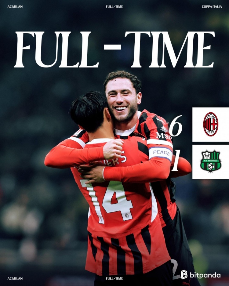 12月4日讯 意杯第3轮,AC米兰主场对阵萨索洛。上半场,丘库埃泽完成双响,赖因德斯、莱奥破门!下半场,卡拉布里亚建功,穆拉蒂耶里扳回一球,亚伯拉罕破门完成传射。最终,AC米兰6-1痛击意乙榜首的萨索洛,晋级意大利杯8强。
