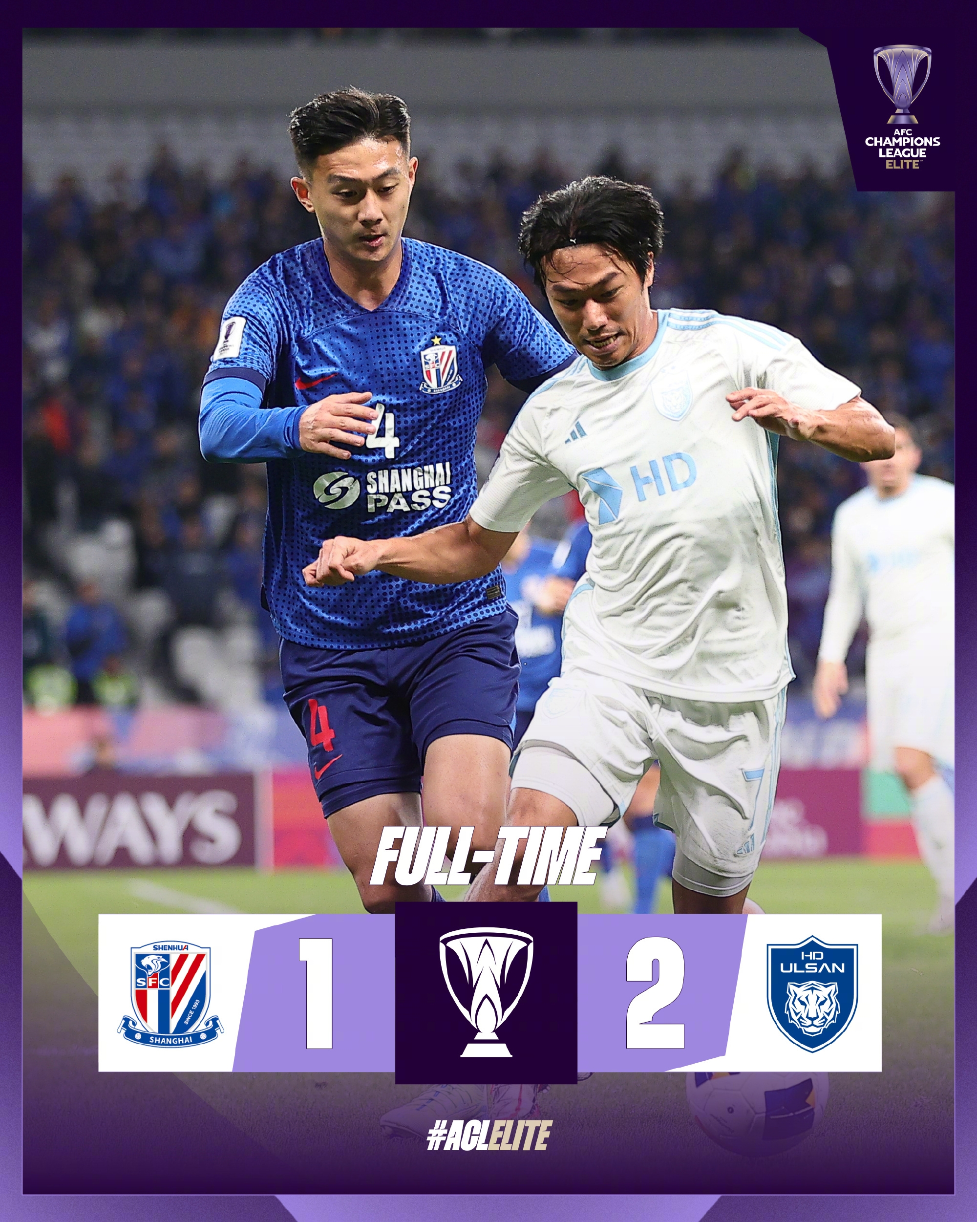 全场比赛结束,上海申花1-2蔚山HD。