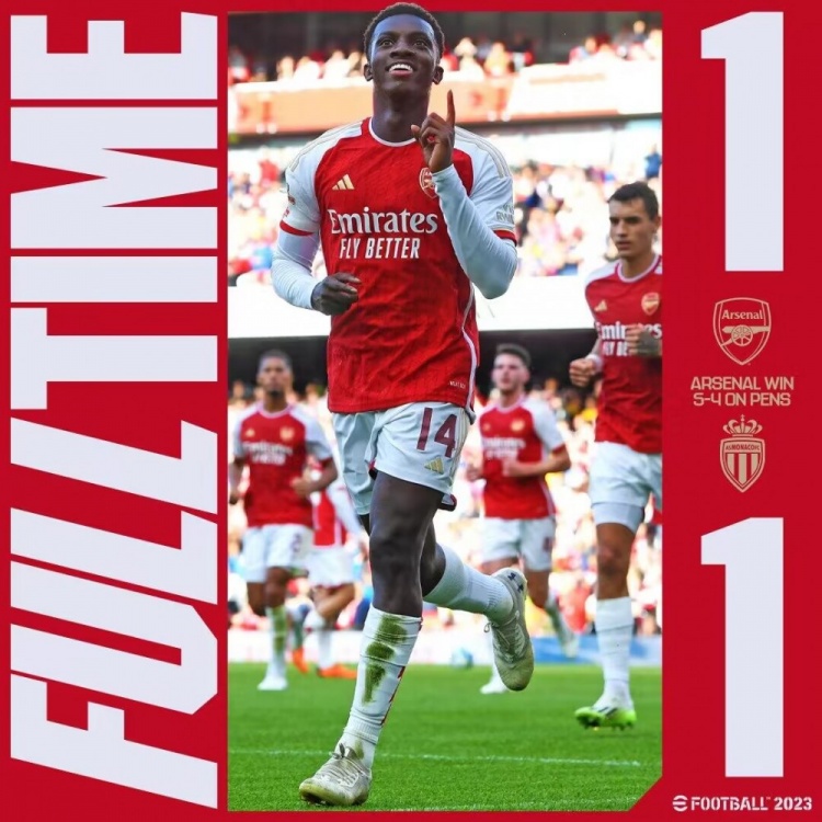全场比赛结束,两队90分钟战成1-1,阿森纳在点球大战5-4胜出,最终阿森纳总比分6-5击败摩纳哥夺冠。