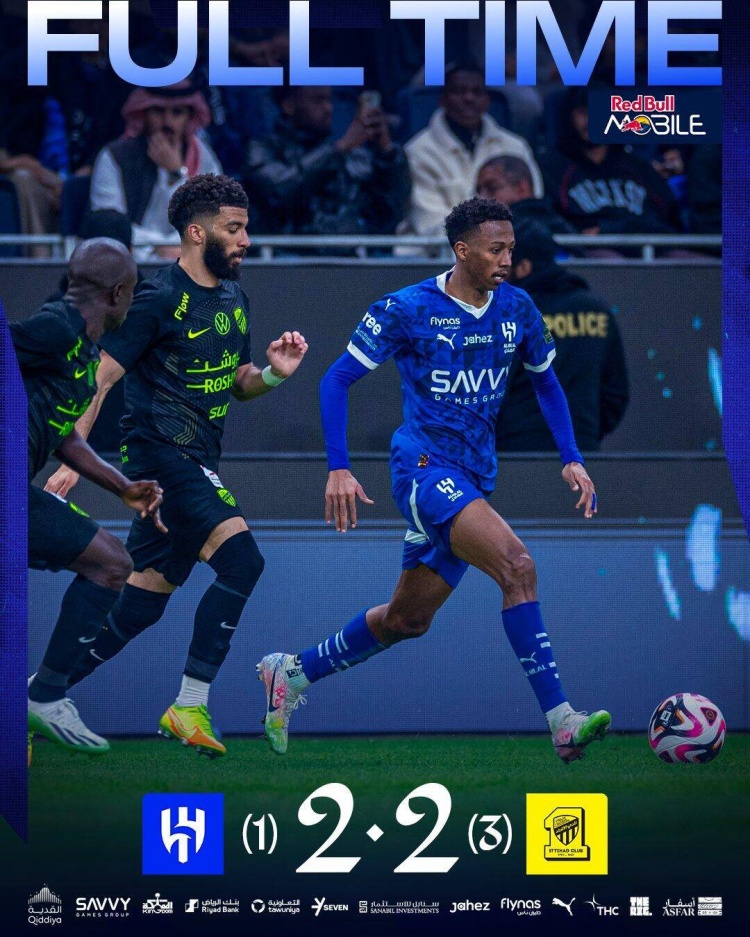 点球大战第二轮,莱昂纳多罚向中路,仍被拉伊科维奇挡出,法比尼奥打进,吉达联合2-0利雅得新月。↓