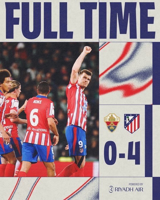 1月16日讯 北京时间4:30,国王杯1/8决赛,马竞客场挑战西乙球队埃尔切,比赛在曼努埃尔-马丁内斯球场打响。上半场,索尔洛特双响。下半场,埃尔切被罚下一人;里克尔梅电梯球破门!阿尔瓦雷斯替补登场再下一城。最终,马竞4-0大胜埃尔切,各项赛事15连胜!晋级国王杯8强!