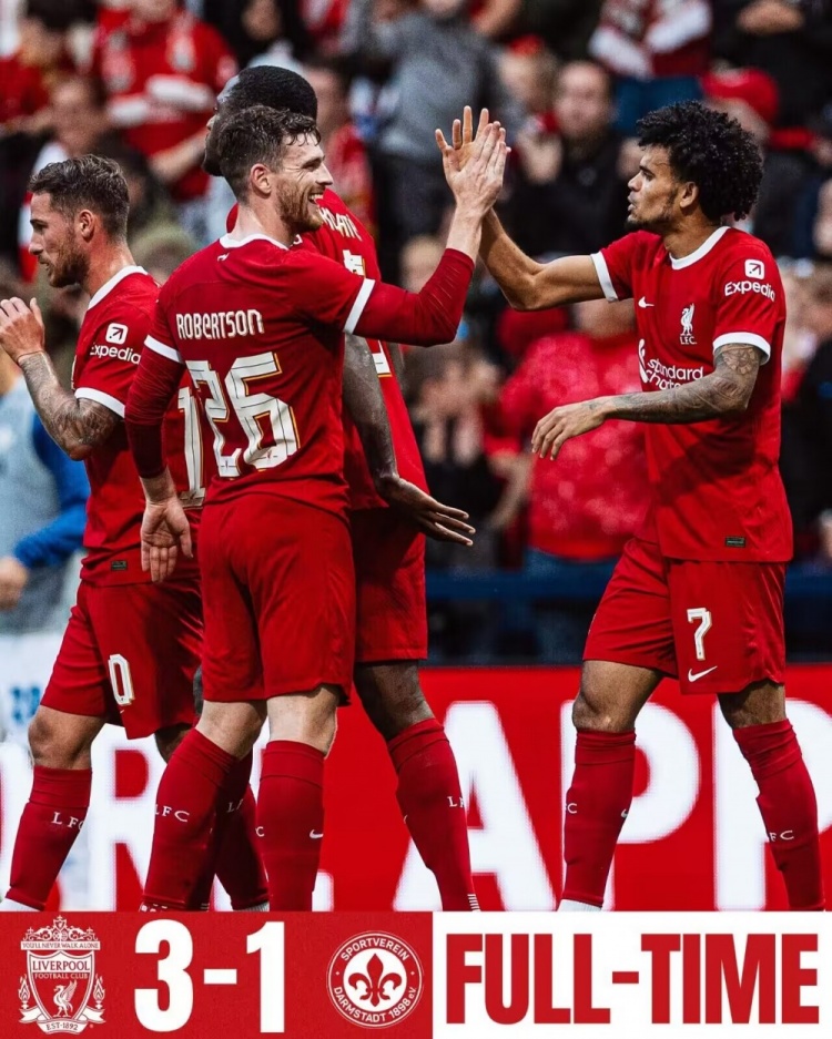 8月8日讯 北京时间8月8日02:00,足球友谊赛利物浦迎战达姆施塔特的比赛,上半场萨拉赫门前推射得手,若塔挑射建功,洪萨克单刀扳回一城,下半场迪亚斯蝎子摆尾式进球,最终利物浦3-1达姆施塔特。