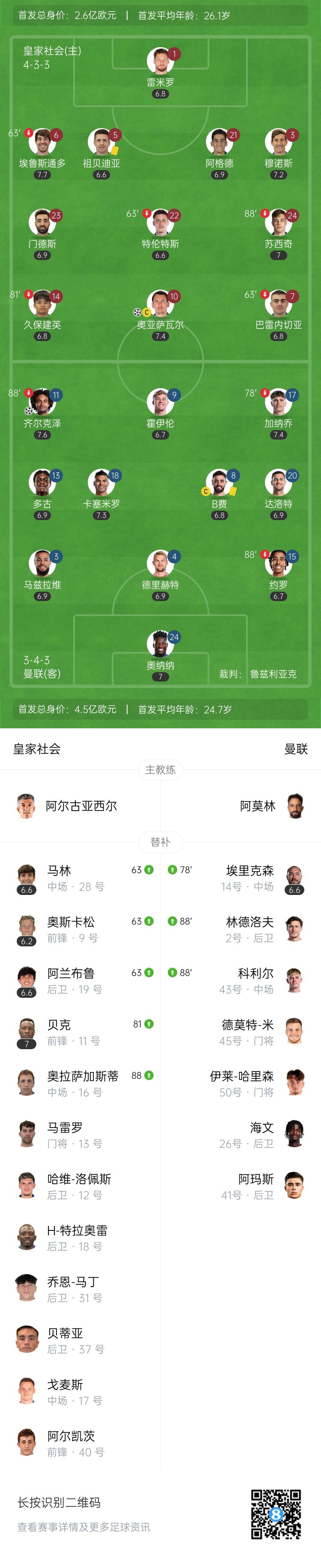 第70分钟,奥亚萨瓦尔主罚点球,这球骗过了奥纳纳打进,皇家社会1-1曼联。↓