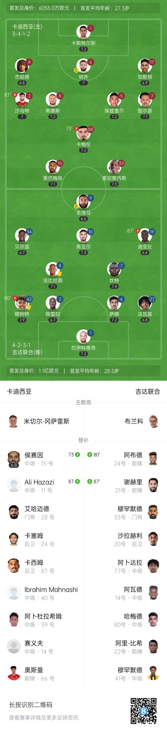 上半场补时2分钟,卡迪西亚0-0吉达联合。