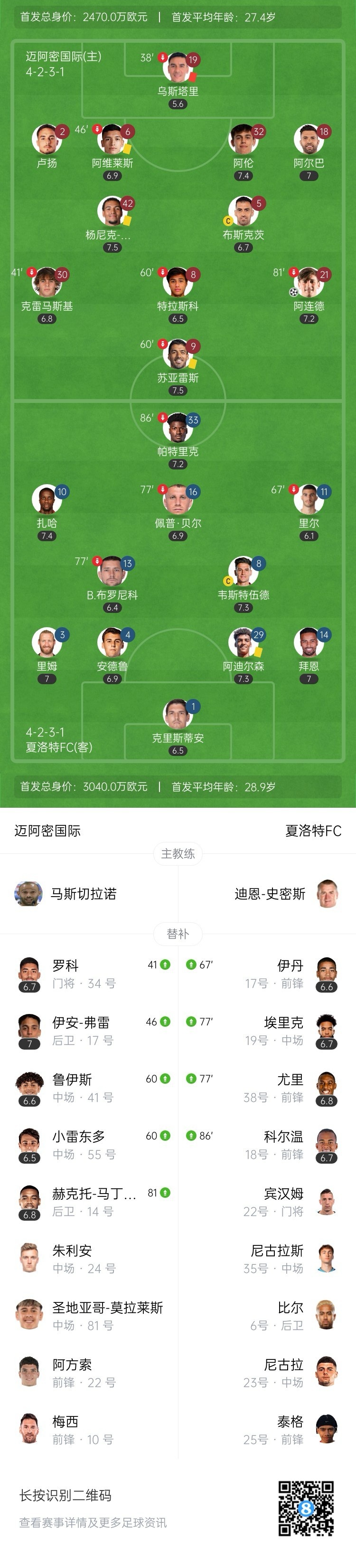 镜头给到替补席上的梅西。↓