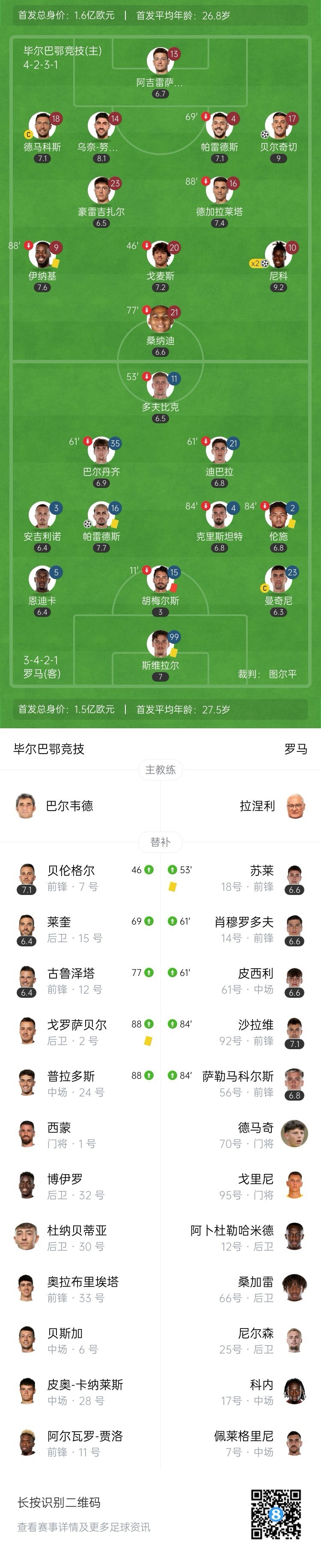 毕巴锁定胜局!尼科双响,贝尔奇切传射!第82分钟,贝尔奇切直塞,尼科-威廉姆斯内切连过两人,面对斯维拉尔轻巧挑射得手,毕巴3-0罗马!总比分毕巴4-2罗马!↓