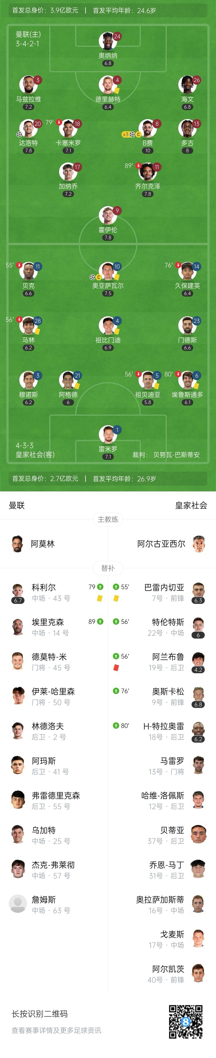 全场比赛结束,曼联主场4-1逆转皇家社会,总比分曼联5-2淘汰皇社晋级欧联八强。