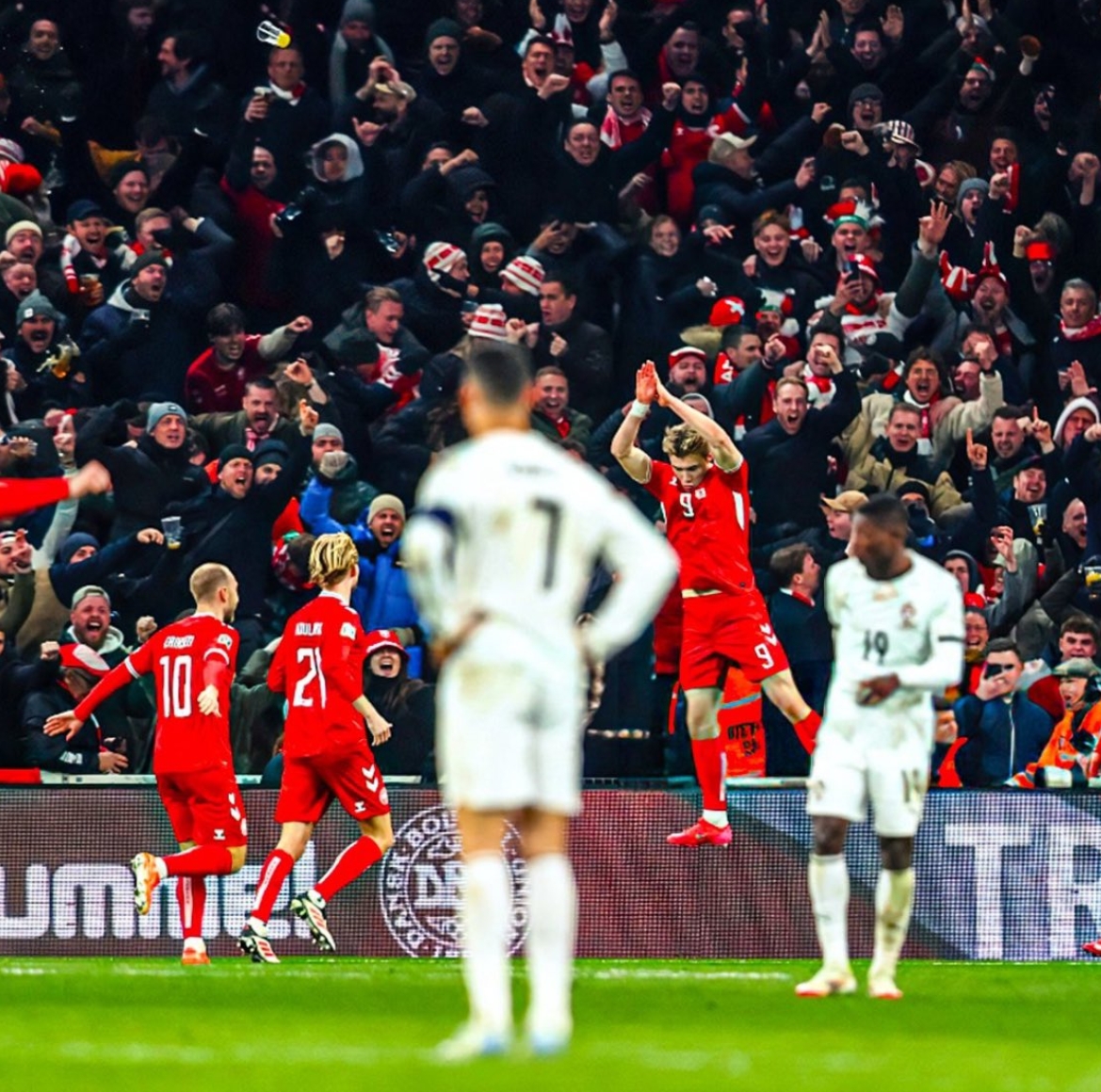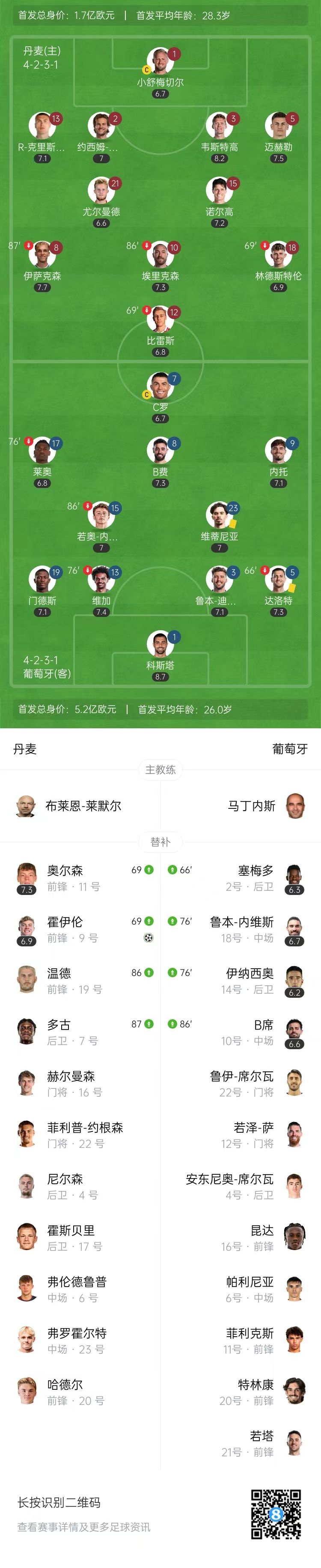 第28分钟,丹麦反击,林德斯特伦左路带球长驱直入,切入中路打门被封堵,随后被门德斯门前解围。↓