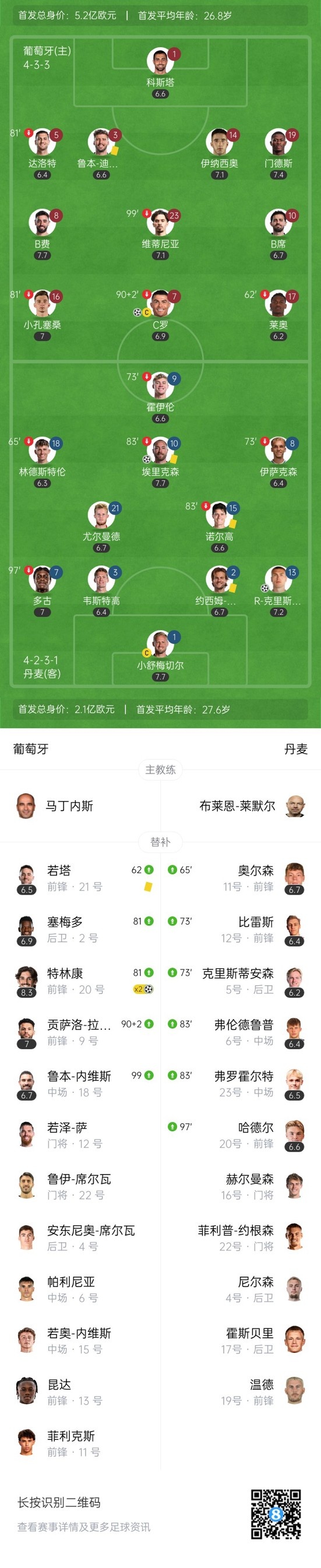 3月24日讯 北京时间3月24日03:45,欧国联八强战次回合葡萄牙迎战丹麦的比赛在阿尔瓦拉德球场进行,上半场C罗开场造点+点射被扑,达洛特头球造险,B费角球造安德森解围自摆乌龙,半场结束,葡萄牙1-0丹麦。下半场埃里克森助攻克里斯滕森头球破门扳平比分,C罗补射破门反超比分,迪亚斯失误埃里克森推射再次扳平,特林康抽射建功,最终葡萄牙3-2总比分3-3丹麦进加时,加时赛特林康低射破门完成双响,B费失良机,拉莫斯推射锁定胜局,最终葡萄牙加时5-2总比分5-3丹麦晋级四强对阵德国。