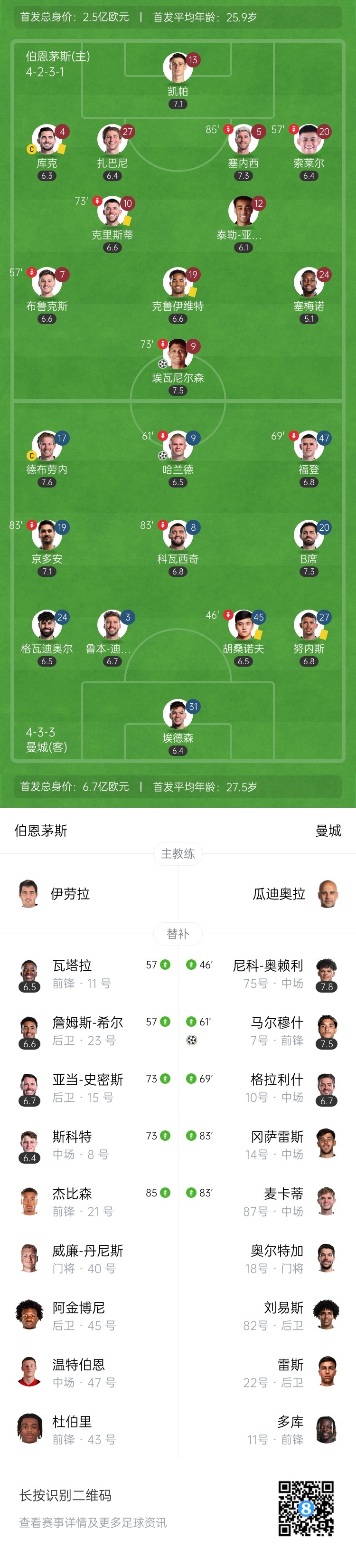 第57分钟,哈兰德受伤,随后下场接受队医治疗,但无法继续坚持比赛,第61分钟被马尔穆什换下。↓