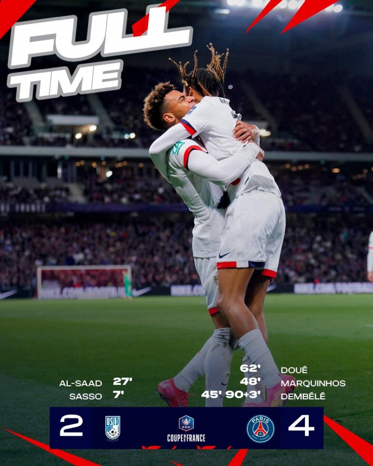 4月2日讯 法国杯半决赛,巴黎作客马塞尔特里布特球场挑战敦刻尔克。上半场,萨索、萨阿德连进两球,登贝莱半场结束前扳回一球。易边再战,马尔基尼奥斯扳平比分,杜埃破门反超比分,补时阶段登贝莱锁定胜局。最终巴黎4-2客胜敦刻尔克晋级决赛。