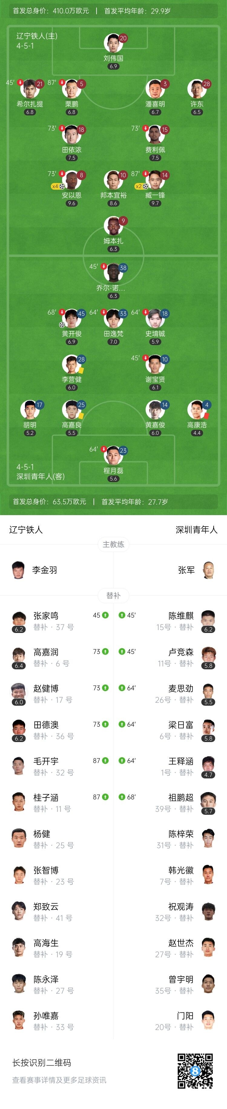 北京时间4月22日晚上19:00,中甲第5轮,辽宁铁人坐镇沈阳奥体中心体育场迎战深圳青年人。上半场,黄开俊破门,安以恩扳平,高康浩直红,安以恩梅开二度,臧一锋再下一城。下半场,安以恩连进两球完成大四喜,臧一锋双响,姆本扎锦上添花。全场结束,辽宁铁人7-1深圳青年人。本场过后,辽宁铁人4胜1负积12分,深圳青年人2胜3负积6分。