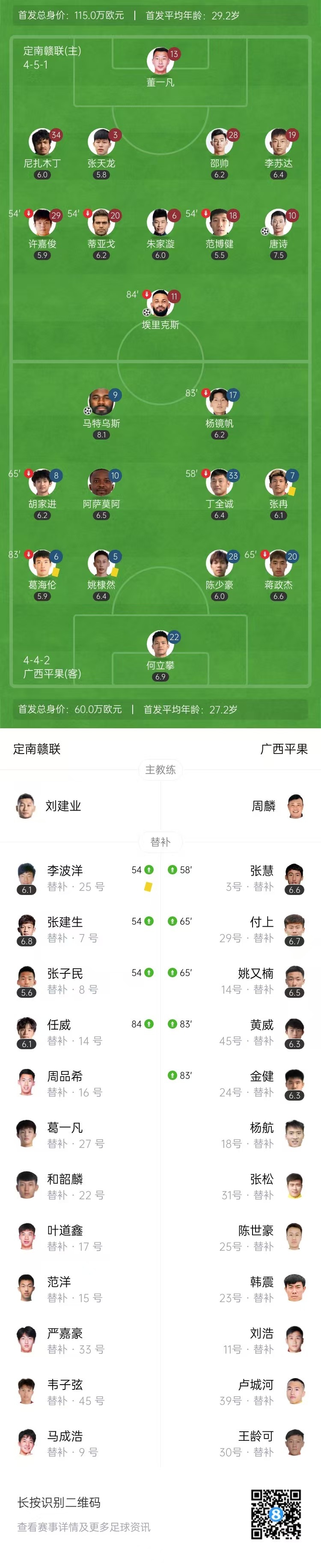 4月27日讯 北京时间4月27日15点,中甲第6轮,定南赣联在主场定南青少年足球训练中心对阵广西平果。上半场,马特乌斯开场1分钟破门,张冉造点,阿萨莫阿点球命中。下半场,埃里克斯和唐诗连扳两球。最终定南赣联2-2战平广西平果。