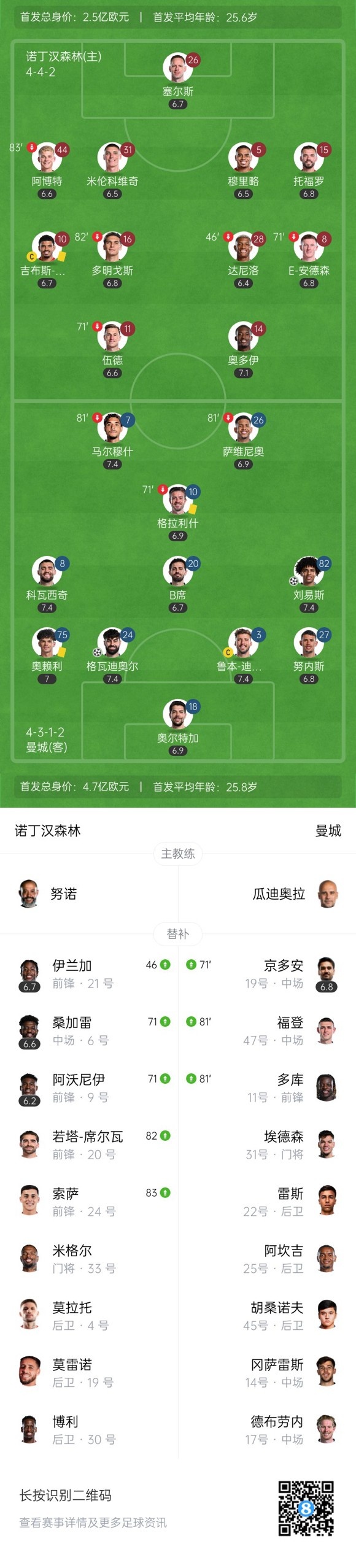 下半场补时4分钟,诺丁汉森林0-2曼城。