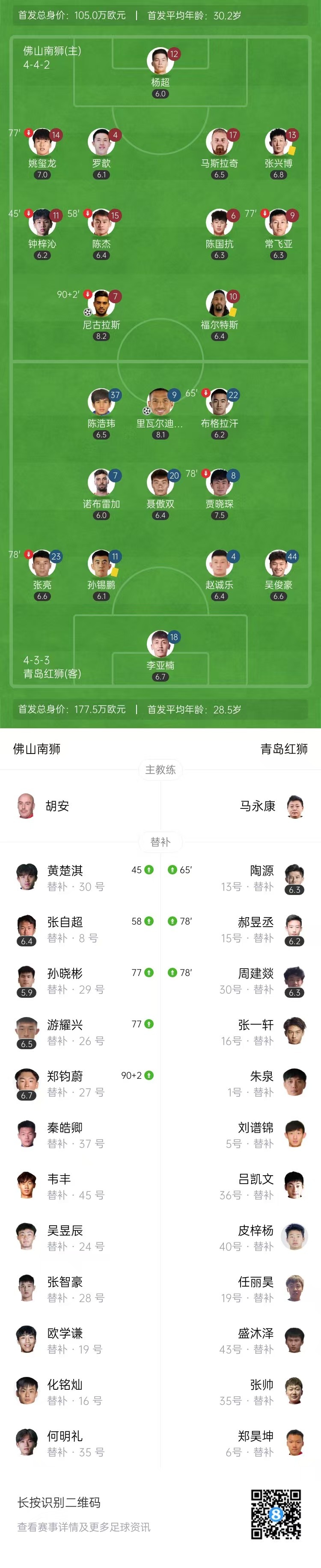 全场比赛结束,佛山南狮1-1青岛红狮。