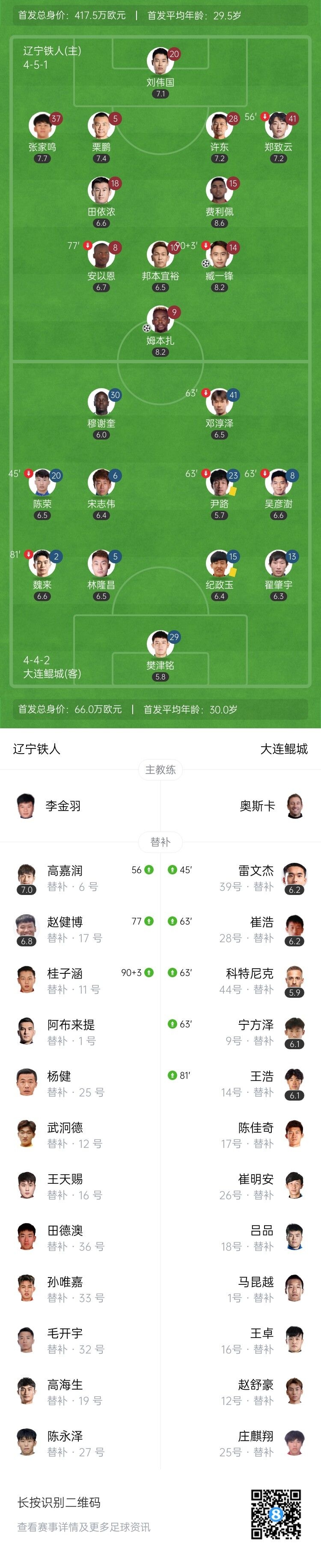 第76分钟,辽宁铁人任意球开出,姆本扎禁区内的凌空推射被樊津铭奋力化解。↓