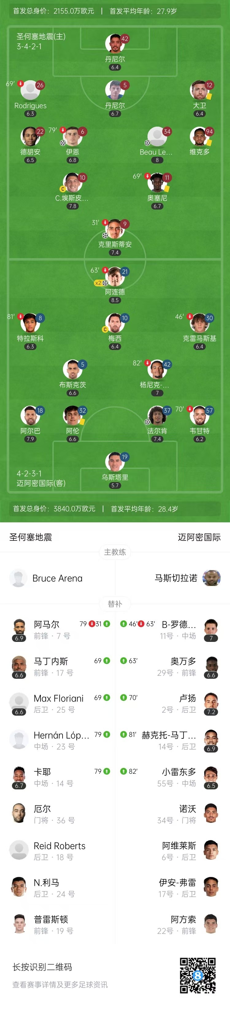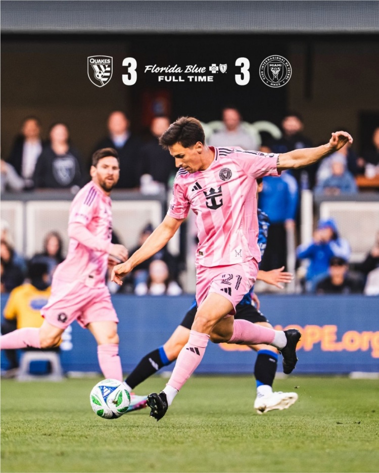 全场比赛结束,迈阿密国际3-3圣何塞地震。