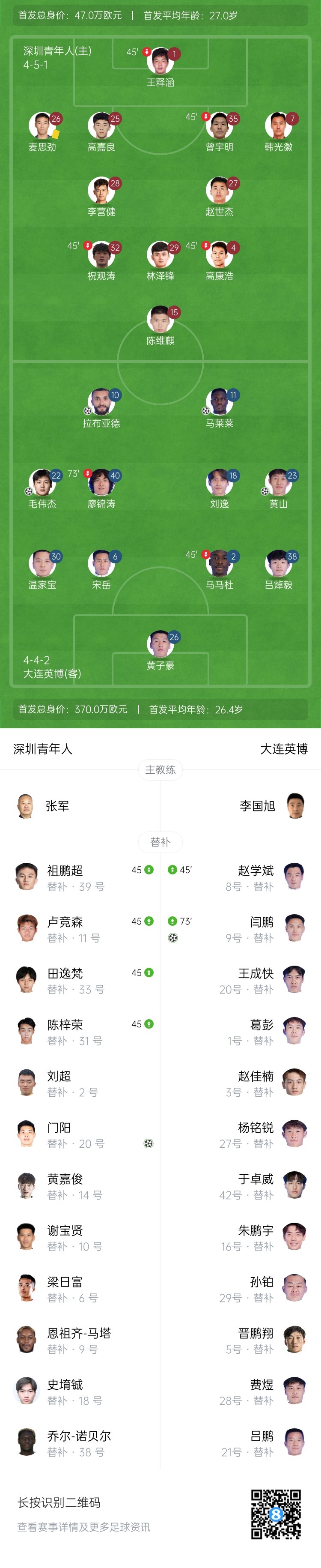 第55分钟,马莱莱右路大范围转移球,拉布亚德停球摆脱闪开空间,随后兜出一脚弧线球命中球门,大连英博3-0深圳青年人。↓
