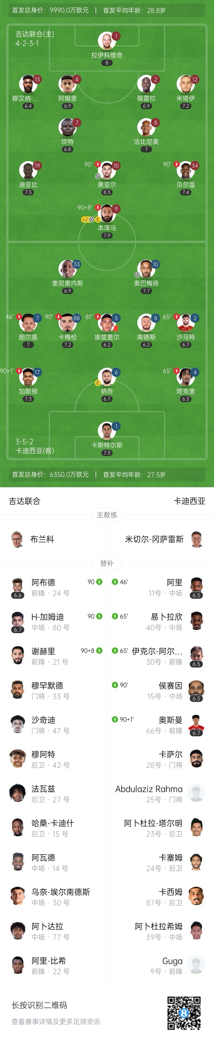 本泽马破门,贝尔温助攻!吉达联合领先!第34分钟,迪亚比内切后直塞,贝尔温反越位插上传中,本泽马包抄胸口撞射破门,吉达联合1-0卡迪西亚!↓