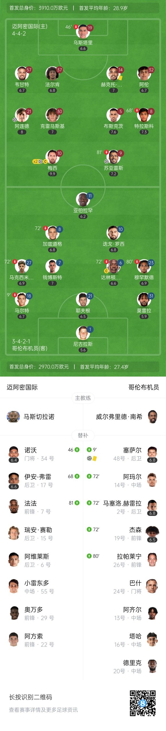 下半场补时2分钟,迈阿密国际5-1哥伦布机员。