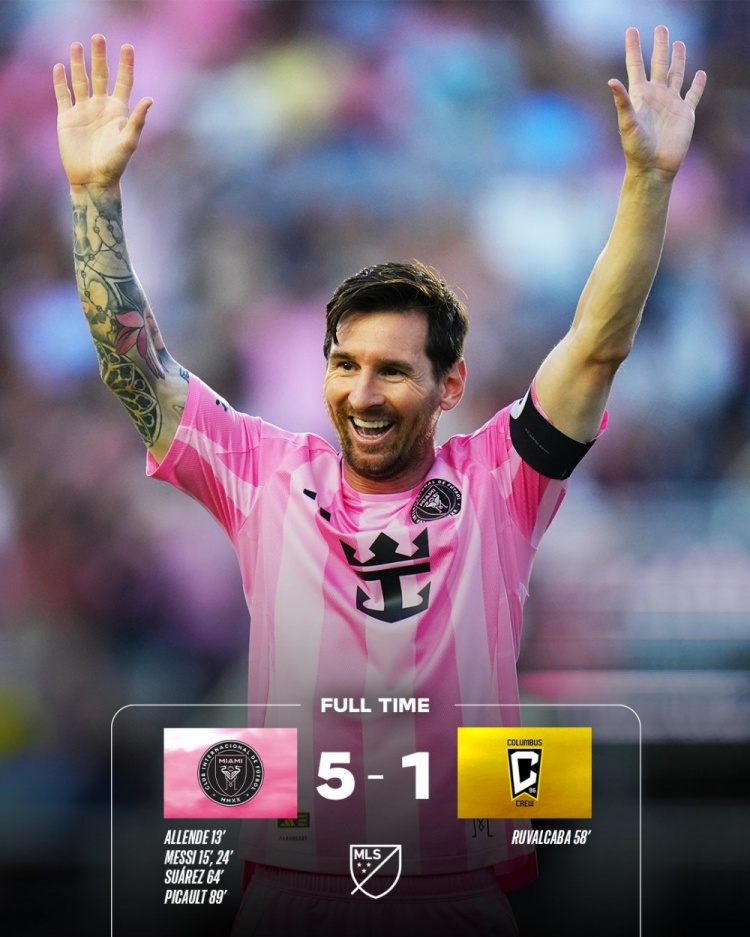 6月1日讯 北京时间6月1日07:30,美职联常规赛迈阿密国际迎战哥伦布机员的比赛在大通体育场进行,上半场梅西2射1传,阿连德单刀破门,布斯克茨献助攻,半场结束,迈阿密国际3-0哥伦布机员。下半场塞萨尔头球扳回一城,苏亚雷斯推射建功,梅西助攻法法推射破门,最终迈阿密国际5-1哥伦布机员取两连胜距榜首4分。