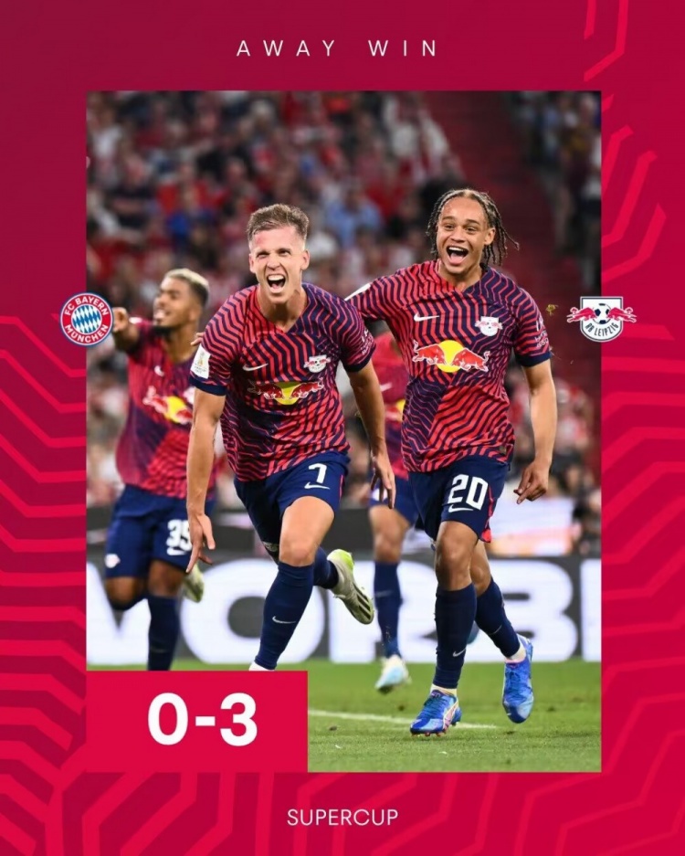 8月13日讯 北京时间8月13日凌晨2点45分,2023年德国超级杯在安联竞技场展开角逐,拜仁慕尼黑坐镇主场迎战RB莱比锡。上半场奥尔莫梅开二度,特尔屡失良机,下半场凯恩替补登场迎首秀,马兹拉维手球送点,奥尔莫点射完成帽子戏法。最终拜仁主场0-3不敌莱比锡,莱比锡夺得队史首座德国超级杯冠军,拜仁新援凯恩无缘个人生涯首冠。
