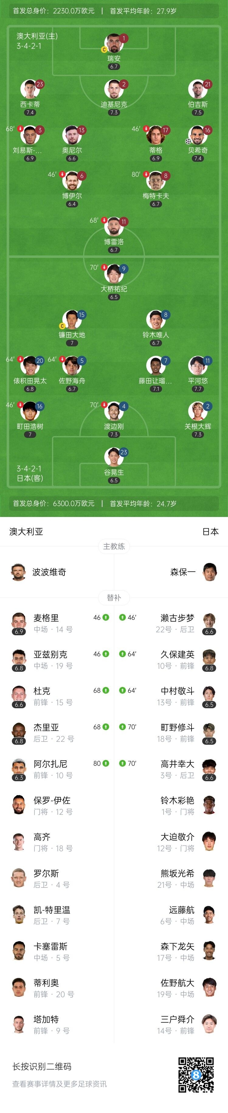 6月5日讯 北京时间6月5日晚上19:10,世预赛亚洲区第三阶段C组第9轮,澳大利亚坐镇奥普特斯体育场迎战日本。上半场,双方均无建树。下半场,久保健英抽射制造威胁,贝希奇90分钟绝杀。全场比赛结束,澳大利亚1-0日本。剩2轮,澳大利亚领先6分基本直通世界杯。