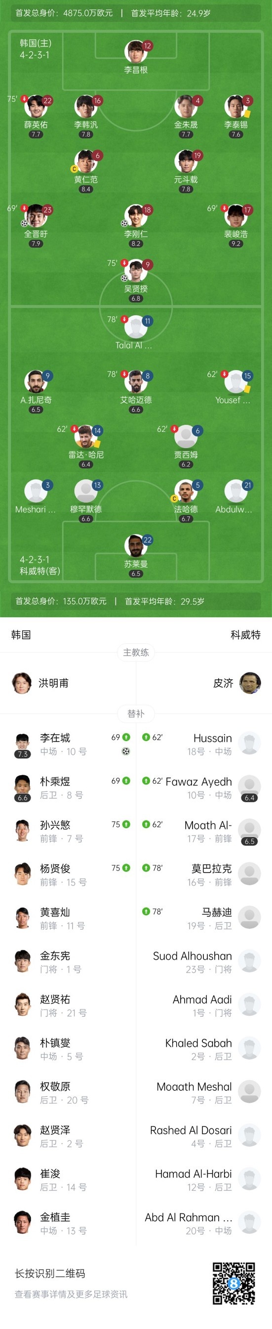 6月10日讯 北京时间6月10日19:00,世预赛亚洲区B组第10轮韩国迎战科威特的比赛在首尔世界杯球场进行,上半场全晋旴头球首开记录,裴峻浩头球中柱,科威特0射正,半场结束,韩国1-0科威特。下半场李刚仁抽射扩大比分,吴贤揆推射建功+中柱,裴峻浩助攻双响,李在城替补建功,孙兴慜替补登场,最终韩国4-0科威特小组不败头名收官。