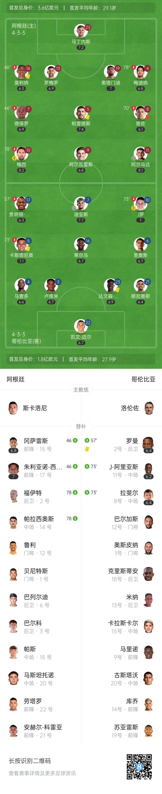 下半场补时5分钟,阿根廷1-1哥伦比亚。