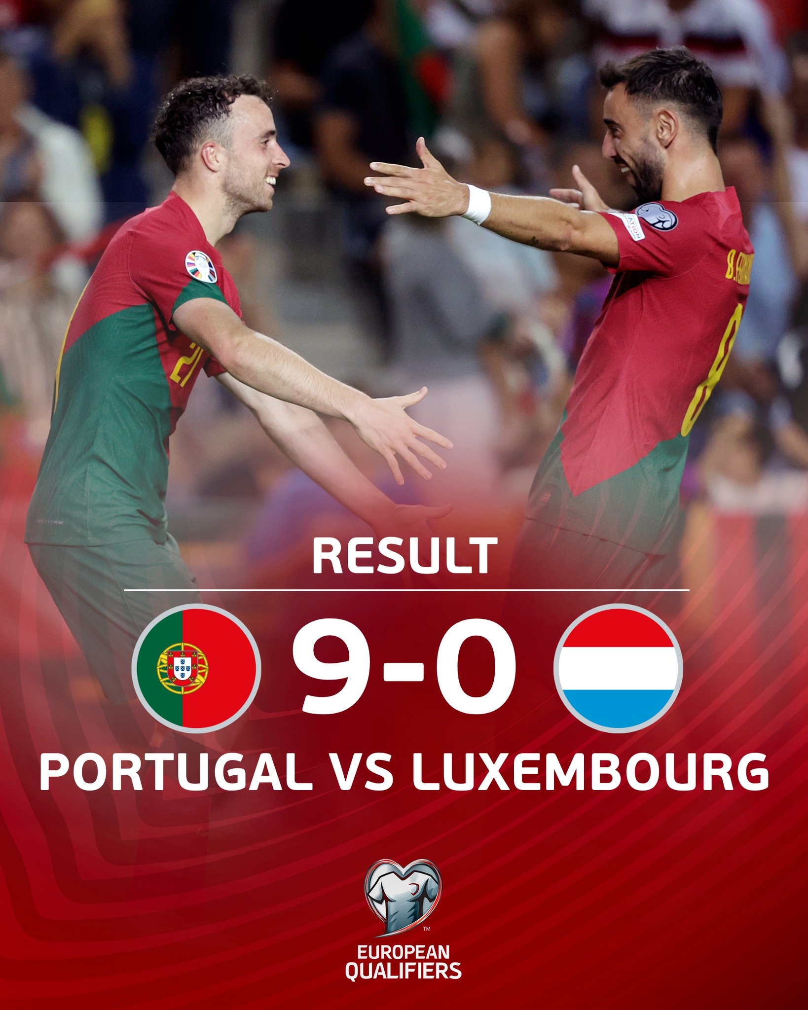 9月12日讯 北京时间9月12日02:45,欧洲杯预选赛小组赛第六轮葡萄牙主场迎战卢森堡的比赛,上半场伊纳西奥头球梅开二度,拉莫斯双响,若塔远射中楣,半场结束,葡萄牙4-0卢森堡。下半场B费完成1射3传,若塔双响,奥尔塔替补出场爆射破门,菲利克斯远射破门,最终,葡萄牙9-0血洗卢森堡,创队史最大比分胜利,六连胜领跑积分榜。