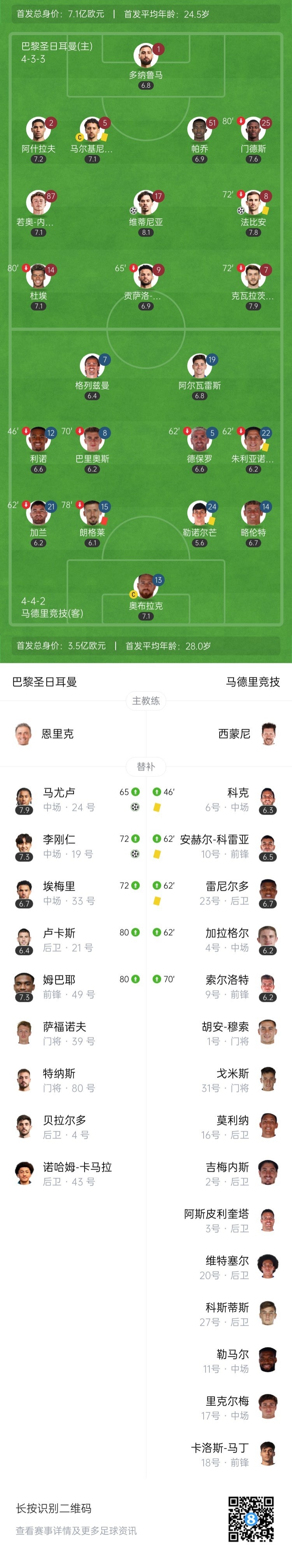 下半场补时4分钟。最终全场比赛结束,巴黎4-0马竞。