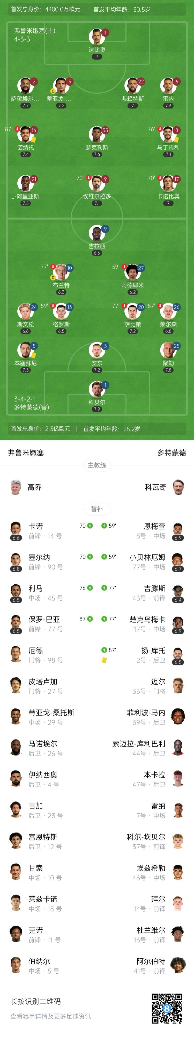 全场比赛结束,弗鲁米嫩塞0-0多特。