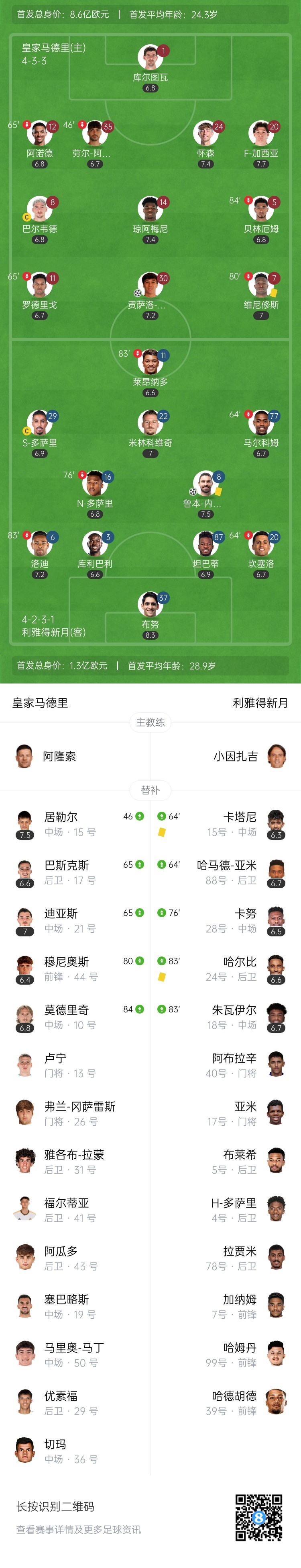 第34分钟,皇马教科书反击,维尼修斯、巴尔韦德连续做球,罗德里戈送出精妙斜塞,年仅21岁的冈萨洛包抄破门,皇马1-0领先↓