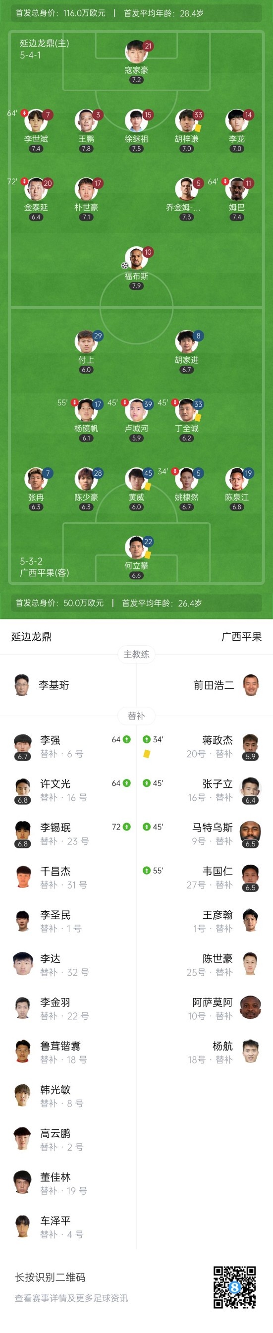 下半场补时10分钟,延边龙鼎1-0广西平果。