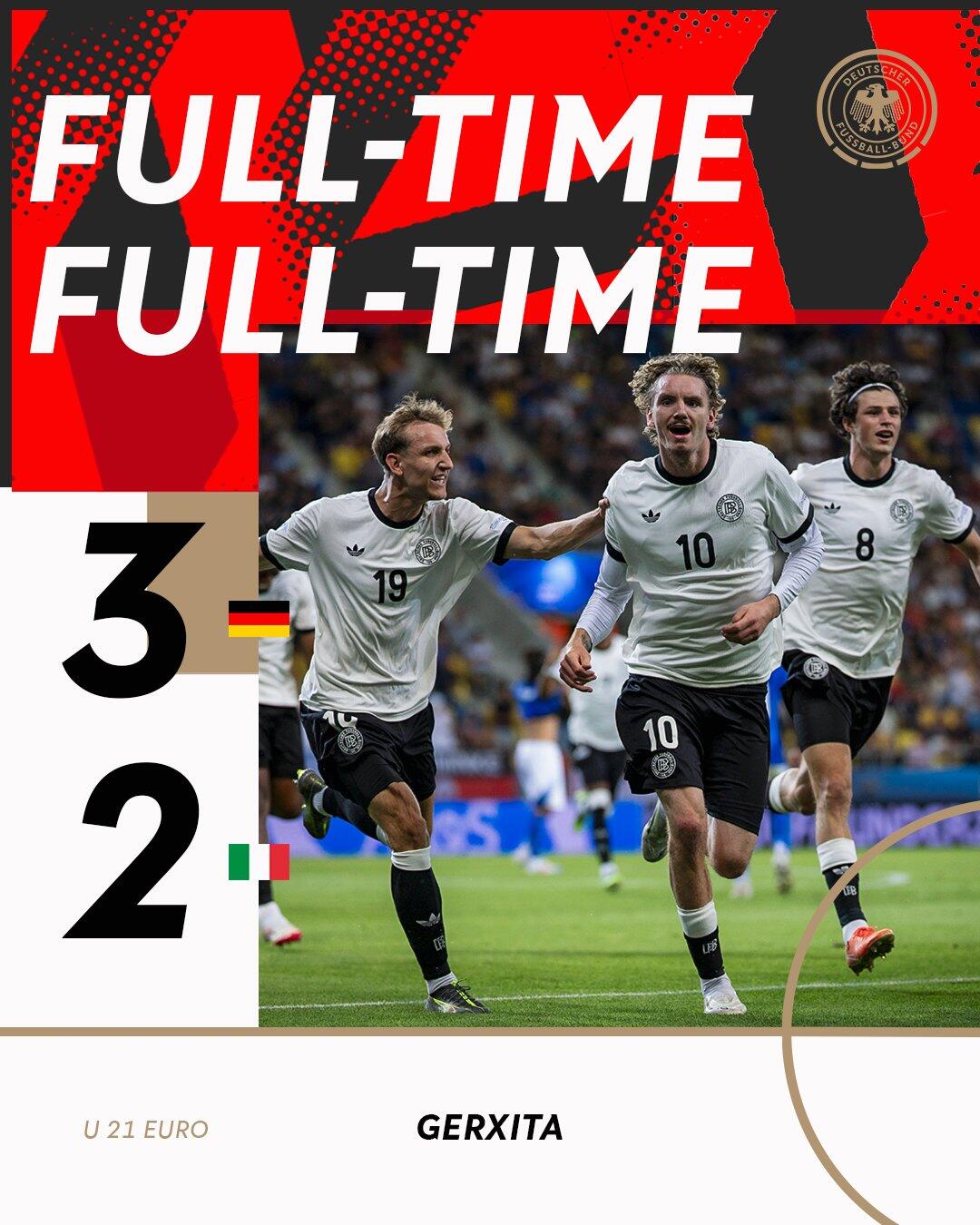 6月23日讯 欧青赛1/4决赛,德国U21对阵意大利U21。上半场,双方互有攻防均无建树。易边再战场面风云突变,科莱奥肖为意大利先拔头筹,沃尔特马德、维普尔破门反超比分,尼翁托、扎诺蒂接连两黄变红被罚下,安布罗西诺第96分钟任意球绝平,双方进入加时赛。加时赛第117分钟罗尔远射绝杀,最终德国U21队3-2意大利U21晋级半决赛,将对阵法国U21。