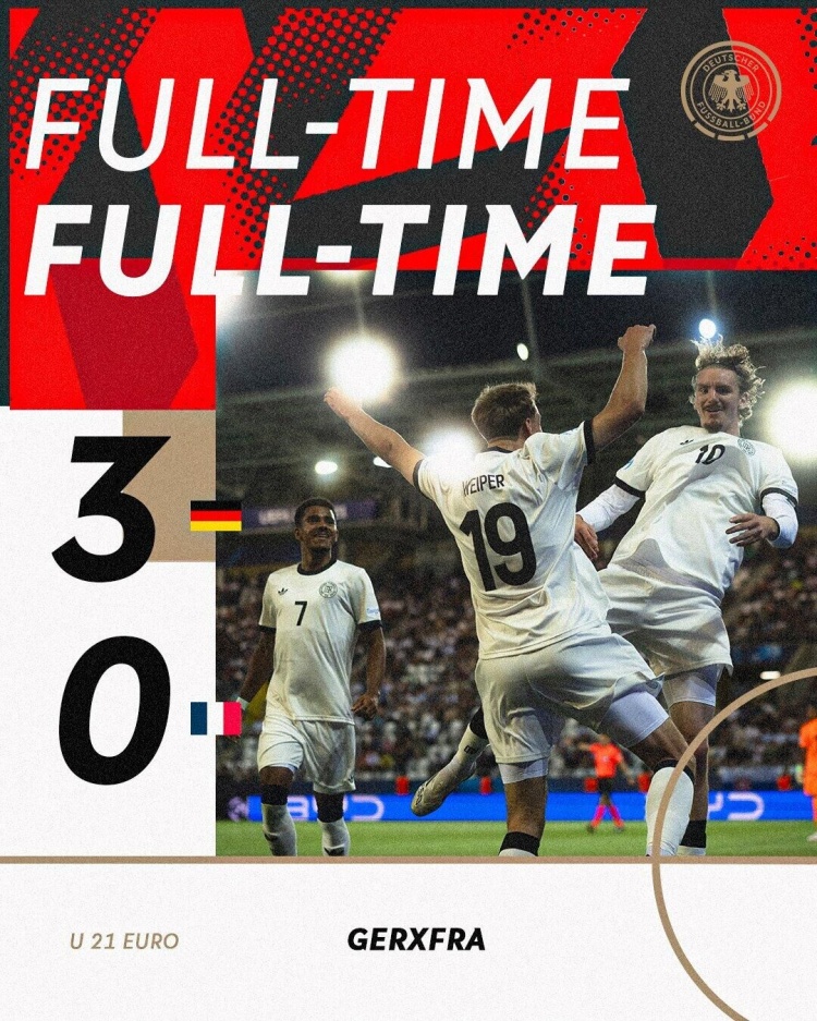 6月26日讯 北京时间6月24日凌晨3:00,欧青赛半决赛,德国U21凭借维普尔、沃尔特马德和格鲁达的进球,以3-0淘汰法国U21,与英格兰U21会师决赛。