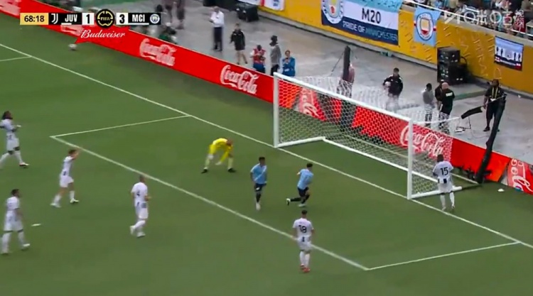 萨维尼奥世界波+传射!第76分钟,曼城的角球机会,哈兰德乱战中打门被迪格雷戈里奥挡出,萨维尼奥外围兜射直挂死角,尤文图斯1-5曼城!↓