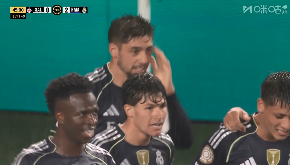 第45+3分钟,居勒尔前场送出直塞,维尼修斯突入禁区内脚后跟回敲,巴尔韦德跟进推射破门,2-0!↓