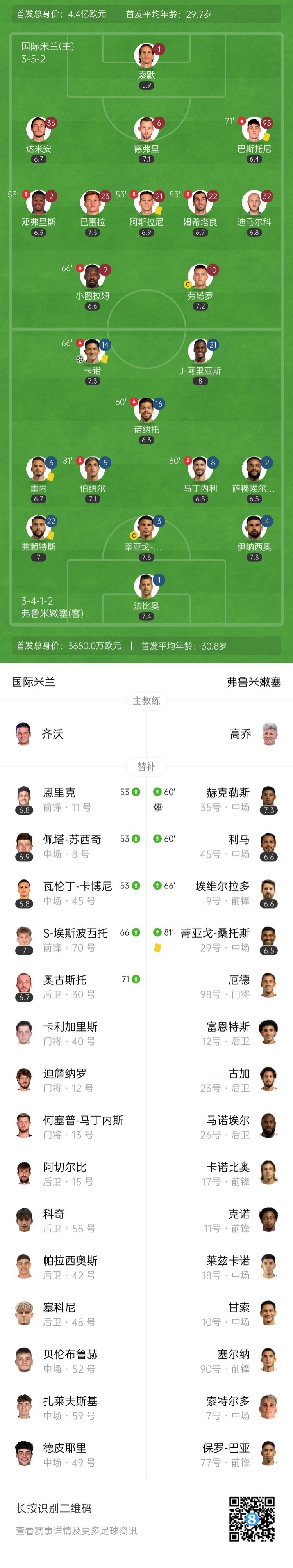下半场补时7分钟。最终全场比赛结束,国米0-2弗鲁米嫩塞。
